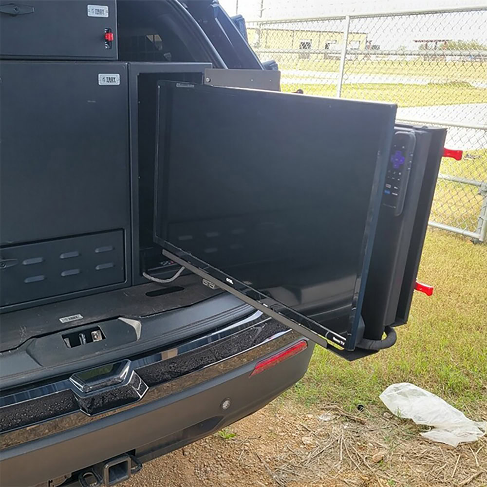 Troy Products Horizontal TV Command Post is a great storage solution. Full enclosure protects expensive electronics from damage. Exterior dimensions of 10”W x 34”L x 24”H. Drawer includes arm mechanism to mount TV along with an adjustable lever. Compatible only with 32″ HD 720P SMART TV (model: 100012589). Elevate your fleet with this rugged Troy TV command post! Designed and engineered with the perfect fit. Proudly manufactured in the USA.