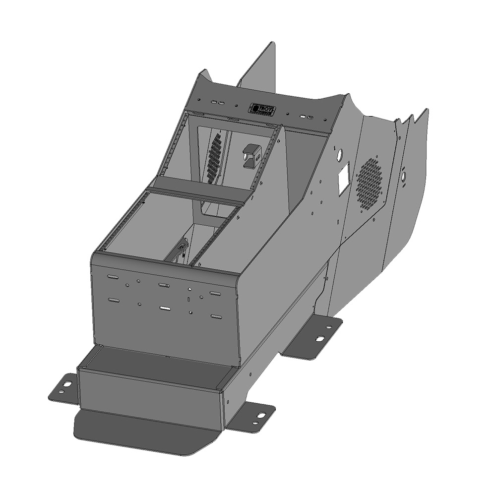 Troy Products Chevrolet Silverado EV Work Truck console features 7″ of sloped faceplate area to mount mission-critical electronics forward and high to ensure a good line-of-sight on the important control heads. 11″ of level faceplate area provides ample space for console accessories such as; cup holders, storage trays, additional outlets and more. Safety, comfort and functionality are all incorporated into this popular console design. Designed and engineered for the perfect fit. Proudly manufactured in the USA.