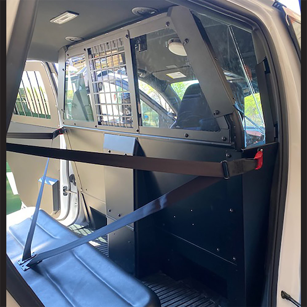 Troy Products Chevrolet Silverado 1500 full-size recessed front partition is designed with a large sliding window for increased driver visibility and view of detainee. Includes center square-hole punched pattern window bolted in place to prevent it from being kicked out with a crawl-through prevention bracket. Sliding window mechanism is out of recessed center area where weapon mounts are bolted. Patented recessed center for accommodating vertical mounting weapons between seats. The upper-side panels are made from .25” thick polycarbonate material. This front partition includes 100% driver-side seat slide for maximum leg room, side-curtain airbag compliance, rigid upper-wing panels designed to prevent access to officers, full tubular partition framing for added strength and integrity and a mounting kit for space-making options. 3-piece lower kick panel extension assembly designed to completely cover the gap between partition bottom and vehicle floor for a snug fit while optimizing back-seat foot room. Lower extension panel easily bolts to the front partition. Features flat driver and passenger-side panels and a recessed center panel. Panel prevents access from underneath partition keeping possessions out of reach of the detainee. No holes drilled design makes installation quick and easy resulting in labor savings! Designed and engineered for the perfect fit. Proudly manufactured in the USA.