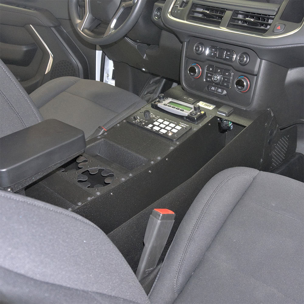 Troy Products Chevrolet Tahoe | Suburban specific wide-body sloped console. 10″ of sloped faceplate area to mount mission-critical electronics forward and high to ensure a good line-of-sight on the important control heads. 8″ of level faceplate area provides ample space for console accessories such as; cup holders, storage trays, additional outlets and more. Easy relocation of the OEM USB / DC outlet for user convenience and it includes one (1) dual USB Waytek port. Safety, comfort and functionality. Designed and engineered for the perfect fit. Proudly manufactured in the USA.