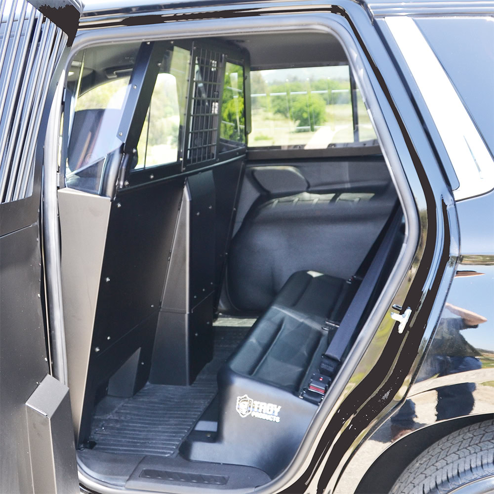 Troy Products Chevrolet Tahoe | Suburban full-size recessed front partition is designed with a large sliding window for increased driver visibility and view of detainee. Includes center square-hole punched pattern window bolted in place to prevent it from being kicked out with a crawl-through prevention bracket. Sliding window mechanism is out of recessed center area where weapon mounts are bolted. Patented recessed center for accommodating vertical mounting weapons between seats. The upper-side panels are made from .25” thick polycarbonate material. This front partition includes 100% driver-side seat slide for maximum leg room, side-curtain airbag compliance, rigid upper-wing panels designed to prevent access to officers, full tubular partition framing for added strength and integrity and a mounting kit for space-making options. 3-piece lower kick panel extension assembly designed to completely cover the gap between partition bottom and vehicle floor for a snug fit while optimizing back-seat foot room. Lower extension panel easily bolts to the front partition. Features flat driver and passenger-side panels and a recessed center panel. Panel prevents access from underneath partition keeping possessions out of reach of the detainee. No holes drilled design makes installation quick and easy resulting in labor savings! Designed and engineered for the perfect fit. Proudly manufactured in the USA.