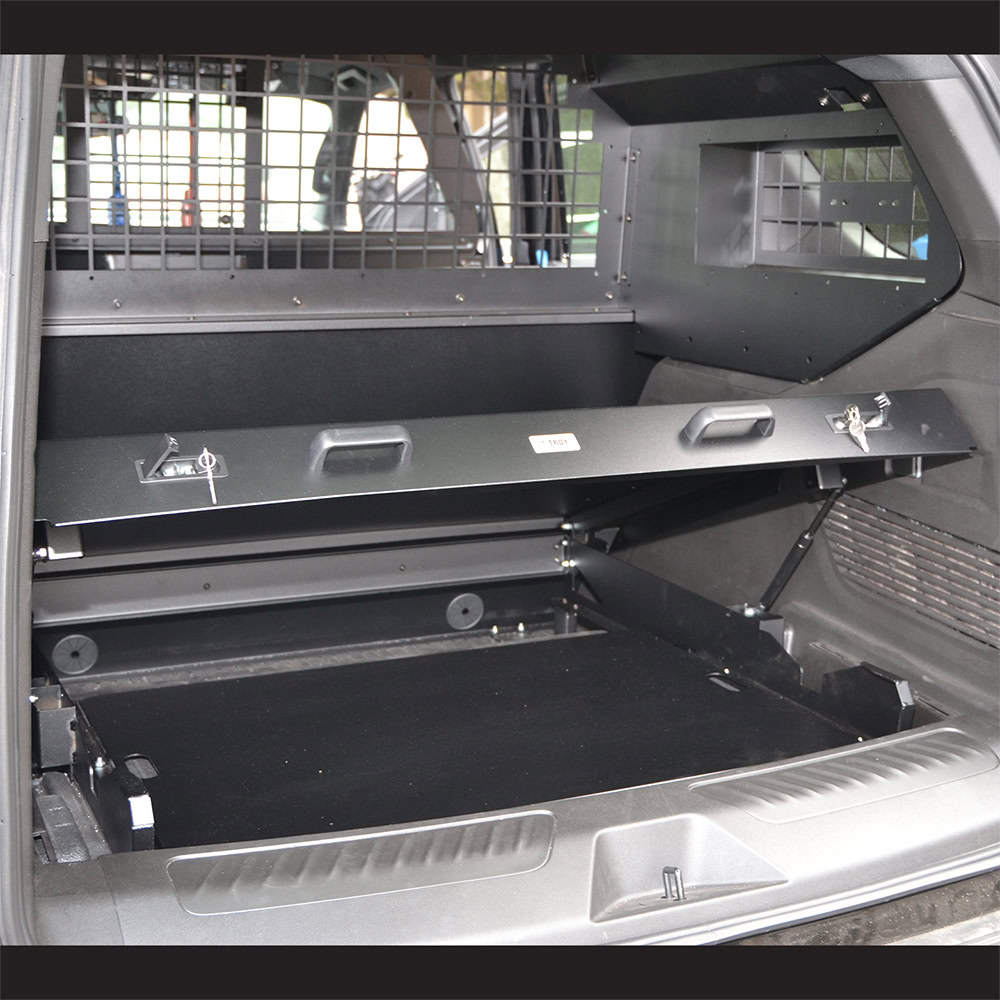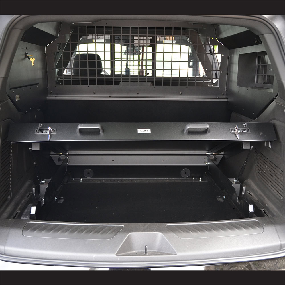 Troy Products Chevrolet Tahoe tilt-up steel-cargo mount replaces the factory floor and provides an extremely strong foundation to mount storage vaults or command posts. Cargo mount bolts to OEM holes for an easy installation. Cargo mount comes punched with a variety of mounting holes that ease installation of Troy command posts and storage vaults. Add an additional electronics tray to complete this innovative design (electronics tray part no. CP-21TH-CARGO-TRAY, 36″W x 10″L x 5.5″H) . Designed and engineered for the perfect fit. Proudly manufactured in the USA.
