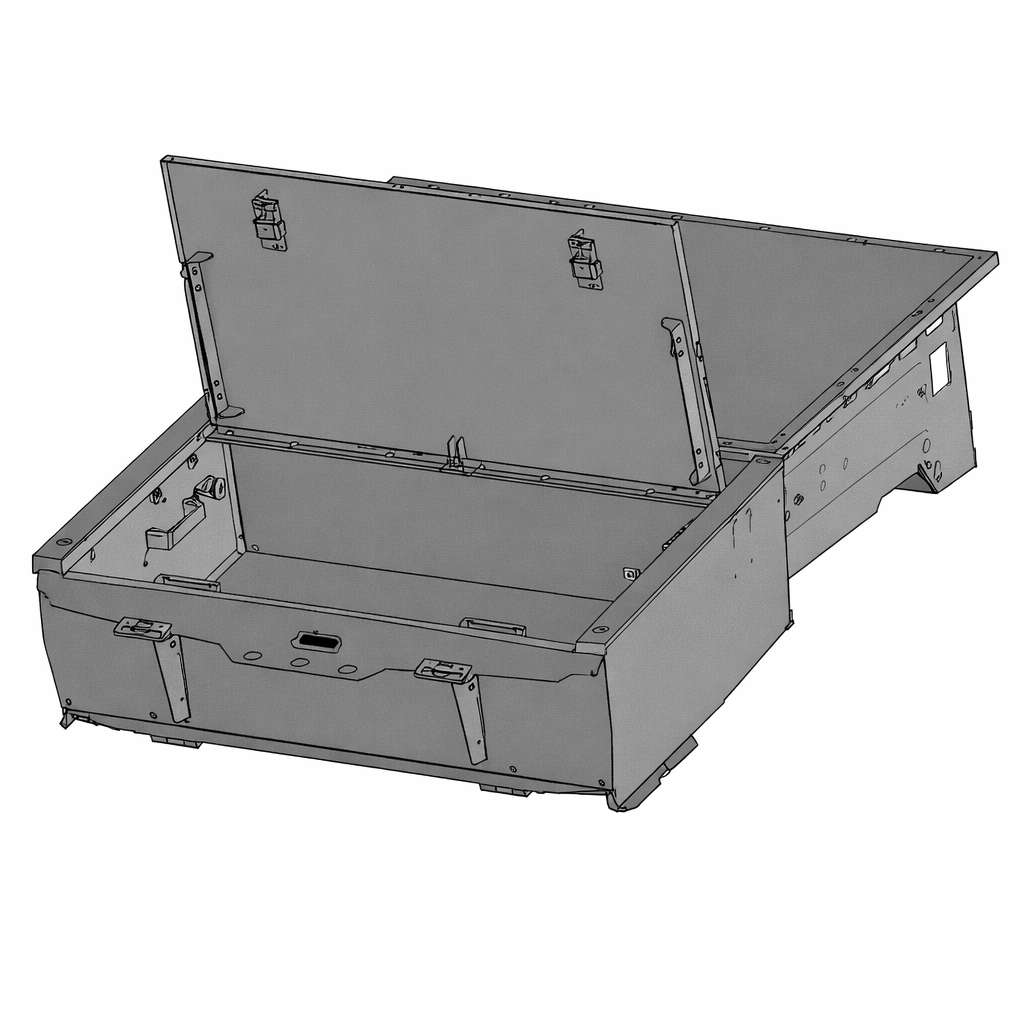 Troy Products Dodge Durango electronics mounting cargo deck with lidded storage system featuring an ergonomically friendly design that offers the most versatile storage options on the market. All components are made from military-grade alloy steel. The cargo deck includes a removable tray with turn locks and handles on each side for easy removal. Bottom tray offers additional storage for electronics. Electronic drawer features heavy duty lock out slides and two (2) compression latches. The entire system is fastened to OEM mounting holes and conforms to the shape of the vehicle for an attractive, simple installation.