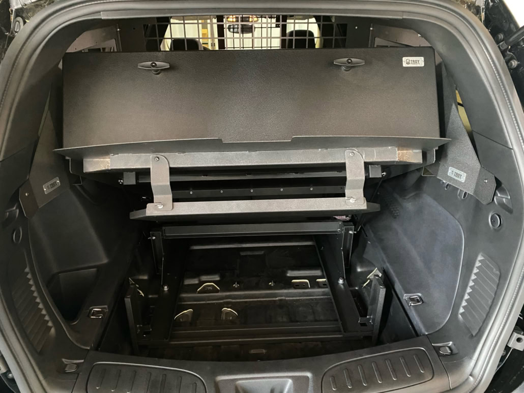 Troy Products Dodge Durango lift-up steel cargo mount serves as a replacement for the factory floor, offering a robust base for mounting storage vaults or command posts. The Durango Prisoner Transport System is essential for installation of this cargo mount. However, it does not work with the rear partition series TP-DUR18-XX. The cargo mount is designed to bolt into OEM holes, facilitating a straightforward installation process, and features a range of punched mounting holes that simplify the setup of various TROY Products command posts and storage vaults. It tilts upward with the help of dual gas shocks, providing easy access to the spare tire. Designed and engineered for an optimal fit. Proudly manufactured in the USA.
