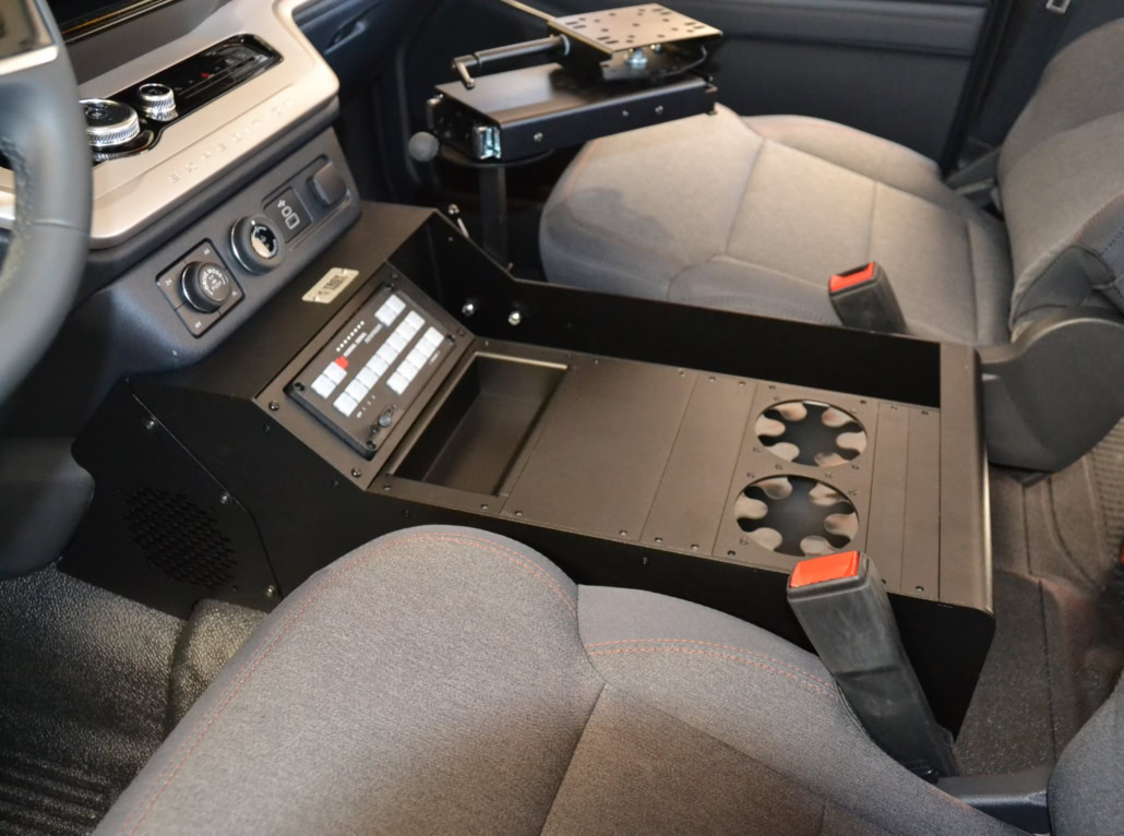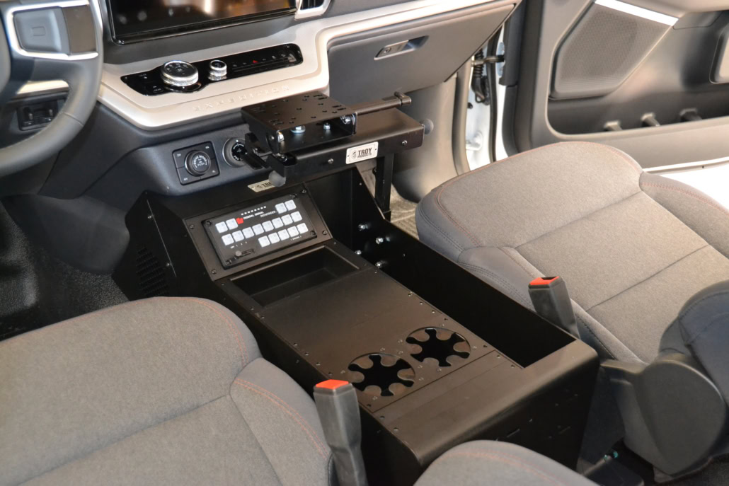 Troy Products Ford Expedition wide-body console with open storage features 4″ of sloped faceplate area to mount mission-critical electronics forward and high to ensure a good line-of-sight on the important control heads. 16″ of level faceplate area provides ample space for console accessories, additional outlets and more. Includes open area on the passenger side for additional storage space. Safety, comfort and functionality are all incorporated into this most popular console design. Designed and engineered for the perfect fit. Proudly made in the USA.