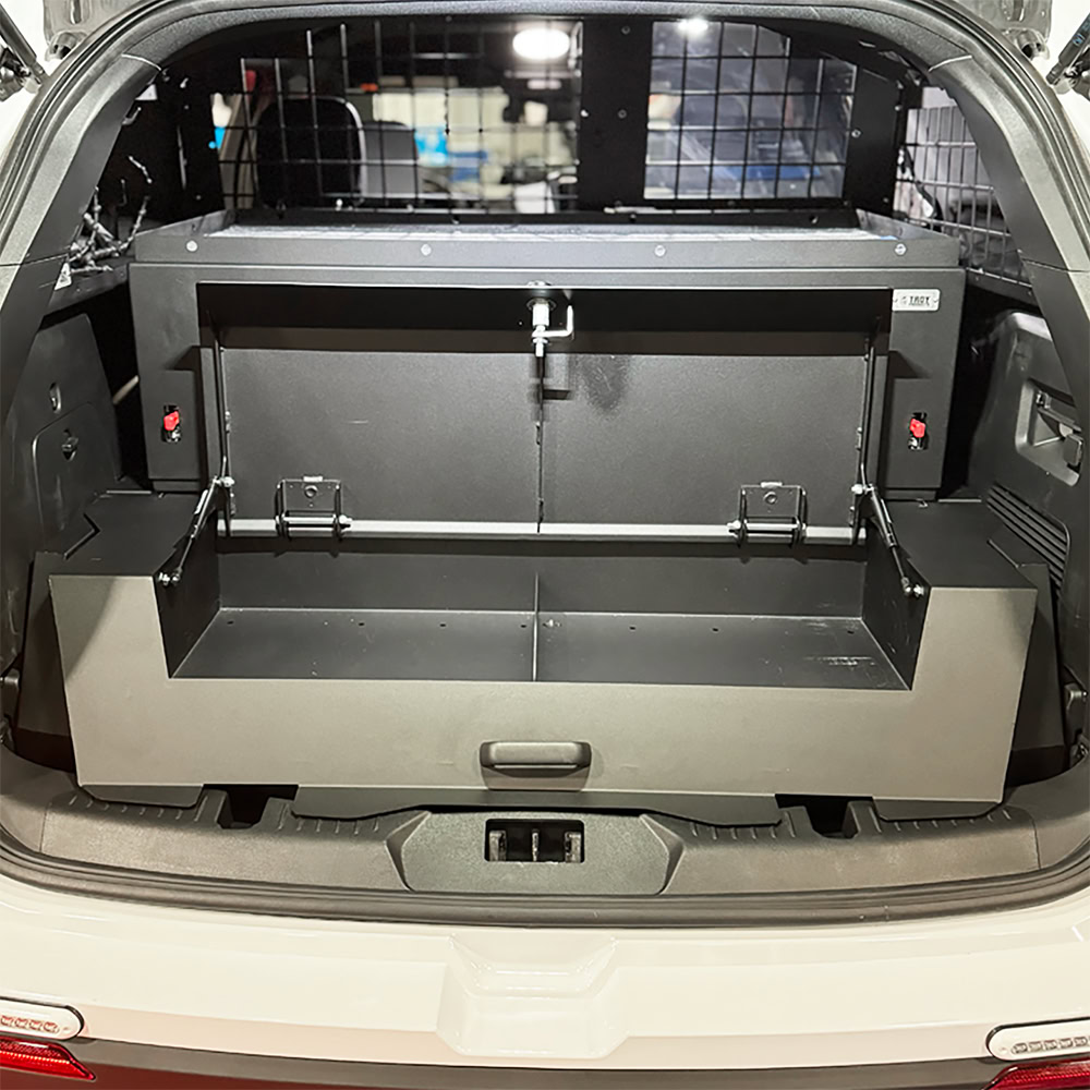Troy Products Ford Police Interceptor Utility electronics mounting cargo deck with lidded storage system featuring an ergonomically friendly design that offers the most versatile storage options on the market. All components are made from military-grade alloy steel. The cargo deck includes a lockable compartment with an aluminum divider for storage. Divider storage sides feature driver and passenger side flare boxes and rubber mat on top for extra grip. Top drawer is equipped with a push button lock with key override and can be used to safely secure weapons and valuable items. Bottom drawer with heavy-duty lock out slides can be used to mount expensive electronic components. Cargo deck also a rubber mat on top of the unit. The entire system is fastened to OEM mounting holes and conforms to the shape of the vehicle for an attractive, simple installation.