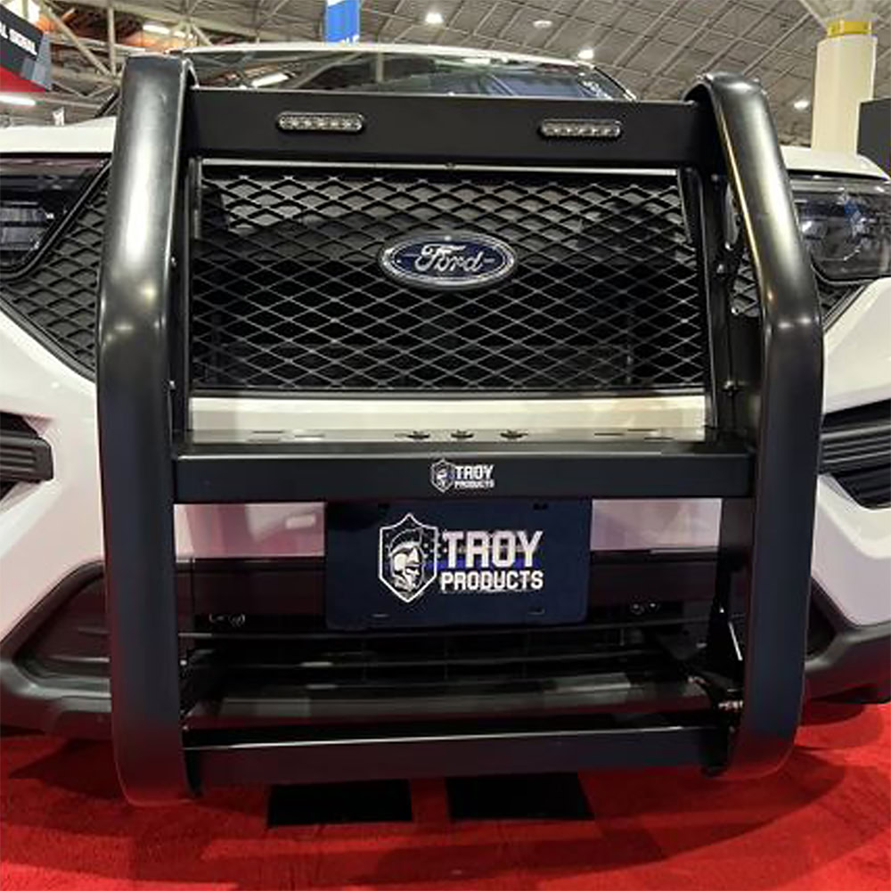 Troy Products Ford Police Interceptor Utility Push Bumper is expertly engineered for each vehicle make and model delivering unmatched coverage, durability and visibility. Light channel is pre-drilled to accommodate all light models. Push Bumpers seamlessly combine aesthetic and functionality to meet the rigorous demands of contemporary police and public safety vehicles. Installation is a breeze with our no-drilling design, utilizing existing OEM holes and slots for rapid set-up. Designed and engineered for the perfect fit. Proudly manufactured in the USA.
