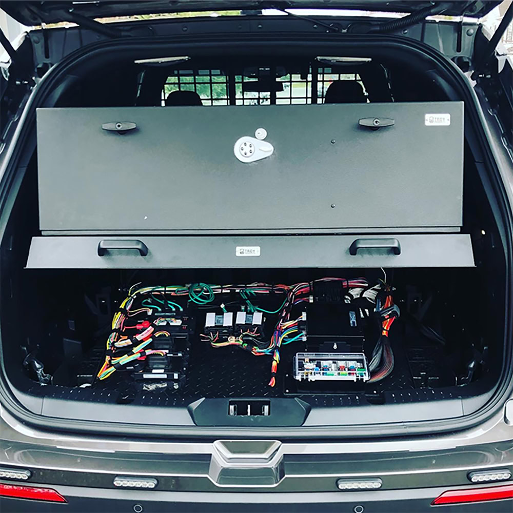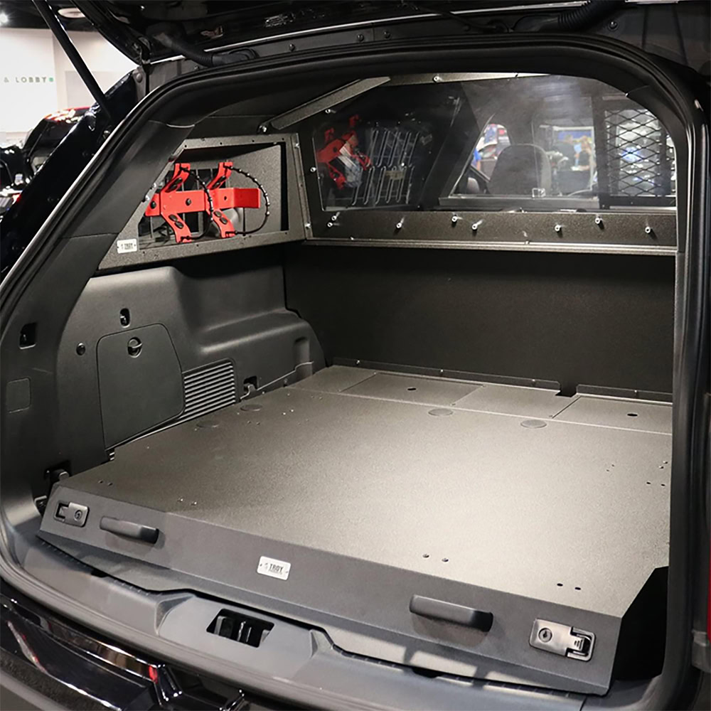 Troy Products offers a Ford PI Utility tilt-up steel cargo mount. This product replaces the factory plastic floor and delivers a robust foundation for mounting storage vaults or command posts. The cargo mount is designed to bolt directly to OEM holes, ensuring a straightforward installation process. It features multiple punched mounting holes that facilitate the installation of various TROY command posts and storage vaults. The mount tilts up with the help of dual gas shocks, providing easy access to the spare tire. To enhance this innovative design, consider adding a TROY tilt-down electronics tray, which creates a safe, ventilated, and secure space for mounting valuable mission-critical electronic components. The level cargo mount floor is compatible with TROY rear partitions and is designed and engineered for an optimal fit. Proudly manufactured in the USA.