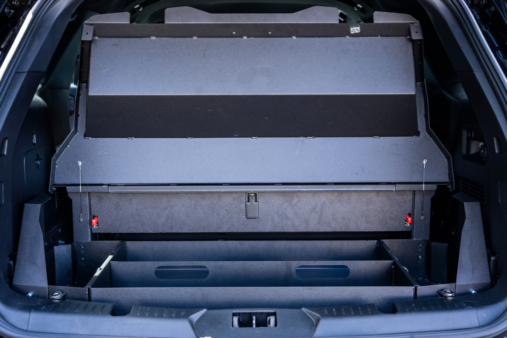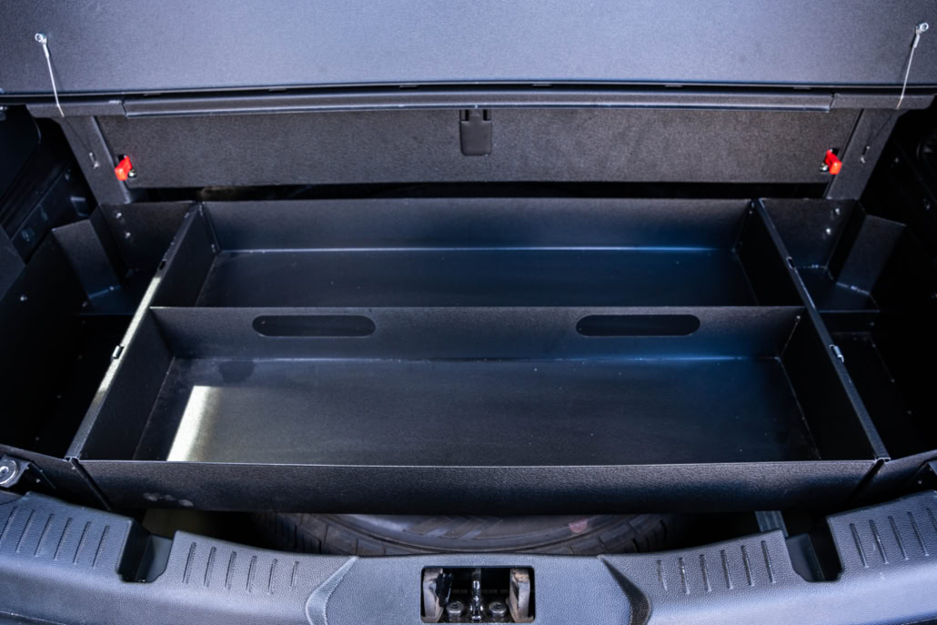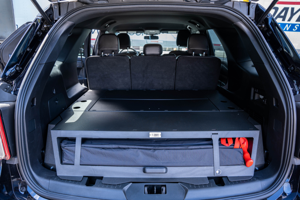 Troy Products Ford Police Interceptor Utility cargo deck system featuring an ergonomically friendly design that offers the most versatile storage options on the market. All components are made from military-grade alloy steel. The lid does not require any latches to be closed, as it is held closed by the same gas spring system which assists in the opening. The lid can be easily opened yet remains firmly closed when in use. The Stop Stick system allows for quick deployment by simply pulling on the Stop Stick straps, due to the magnetic latching system retaining them. The entire system is fastened to OEM mounting holes and conforms to the shape of the vehicle for an attractive, simple installation.
