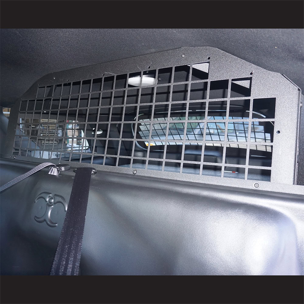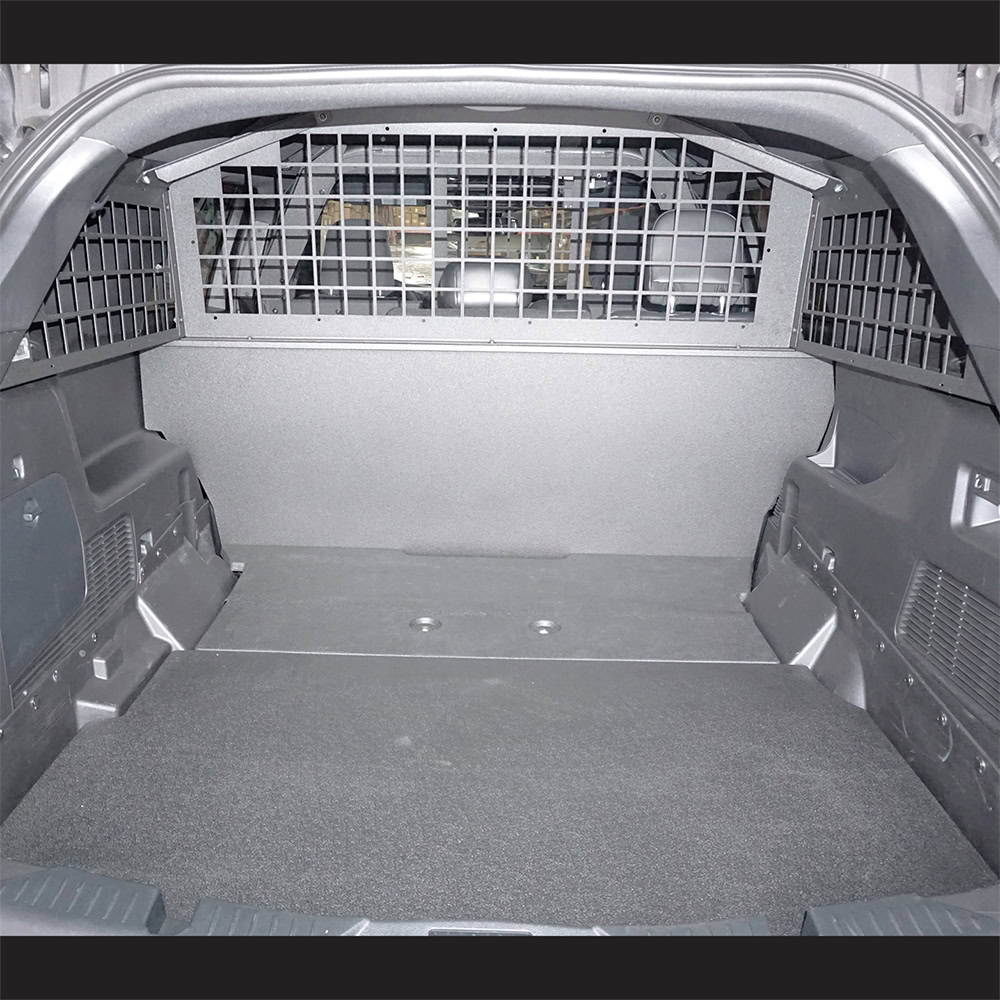 Troy Products Ford Police Interceptor Utility | Explorer Civilian specific cargo partition is designed to keep the cargo area of SUV secure, while also providing features not readily available in other partitions on the market. This cargo partition is a 3-sided standard square-hole punched window guards design. Our unique partition mount has been airbag tested and confirmed to be compatible with airbag deployment. Cargo partitions and PTS plastic seat combination are compatible with TROY storage vaults. For 100% cargo area security, add hatch window screen part no. AC-20-UV-HATCH. No holes drilled design makes installation quick and easy resulting in labor savings! All welded construction made of steel, powder coat finish for years of even the most rugged service.