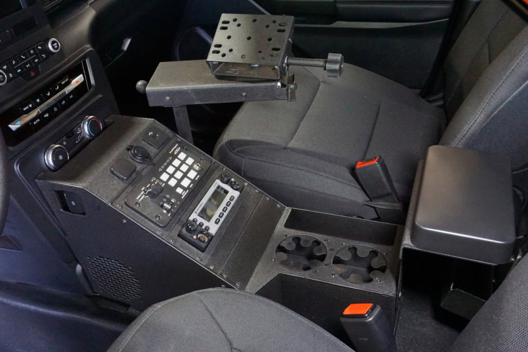 Troy Products Ford Police Interceptor Utility vertical console bolts directly to OEM mounting locations in the vehicle and does not require a floor plate. Features a cutout on the side of the console allows clearance for an officer’s weapon when seated along with a built in dual beverage holder, and a passenger-side open compartment. Included with console adjustable armrest with a 5 x 8 foam pad. This console is easy to install and easy to use. Designed and engineered for the perfect fit. Proudly manufactured in the USA.