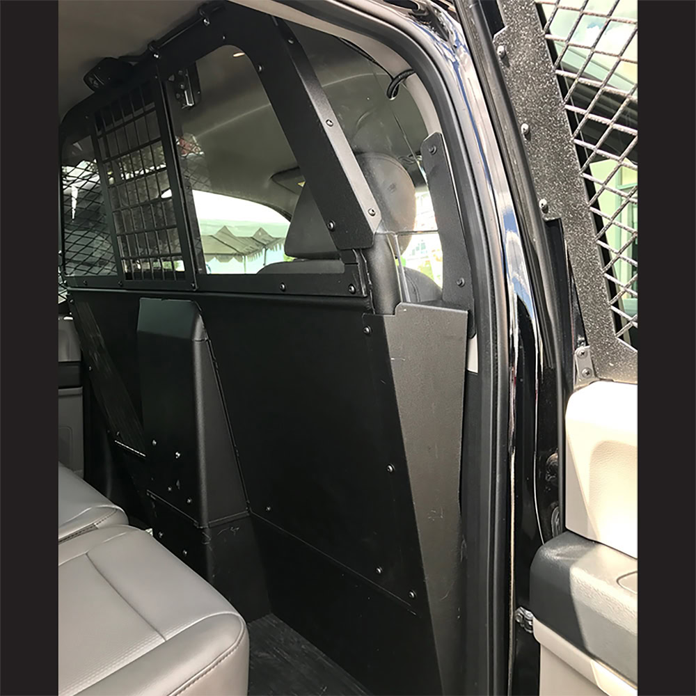 Troy Products Ford F150 | F250 full-size recessed front partition is designed with a large sliding window for increased driver visibility and view of detainee. Includes center square-hole punched pattern window bolted in place to prevent it from being kicked out with a crawl-through prevention bracket. Sliding window mechanism is out of recessed center area where weapon mounts are bolted. Patented recessed center for accommodating vertical mounting weapons between seats. The upper-side panels are made from .25” thick polycarbonate material. This front partition includes 100% driver-side seat slide for maximum leg room, side-curtain airbag compliance, rigid upper-wing panels designed to prevent access to officers, full tubular partition framing for added strength and integrity and a mounting kit for space-making options. 3-piece lower kick panel extension assembly designed to completely cover the gap between partition bottom and vehicle floor for a snug fit while optimizing back-seat foot room. Lower extension panel easily bolts to the front partition. Features flat driver and passenger-side panels and a recessed center panel. Panel prevents access from underneath partition keeping possessions out of reach of the detainee. No holes drilled design makes installation quick and easy resulting in labor savings! Designed and engineered for the perfect fit. Proudly manufactured in the USA.