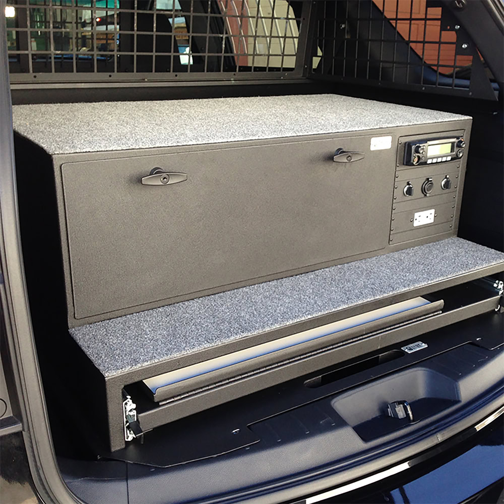 • Top module features a spacious storage drawer along with a 10″ area designated for mounting equipment and accessories
