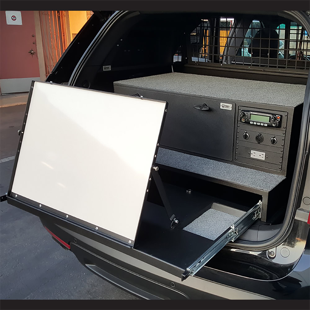 Troy Products mid-size modular command post is crafted to fulfill the rigorous operational requirements of mobile field commanders. It features a full-width magnetic pop-up whiteboard that offers ample space for crucial field notes during critical incidents. The lock-out slides ensure the unit remains extended, even on uneven surfaces. The angle can be easily modified to achieve the most effective working position. Additionally, it includes a large storage drawer for essential mission gear and 10″ of faceplate area for vital radio controllers and extra electrical outlets, equipping users to handle the most demanding command scenarios. It also allows access to the spare tire in the Ford PI Utility when paired with a TROY cargo mount. Constructed from aluminum to minimize weight, its all-welded design guarantees durability under the toughest conditions. This product is designed and engineered for an optimal fit. Proudly manufactured in the USA.