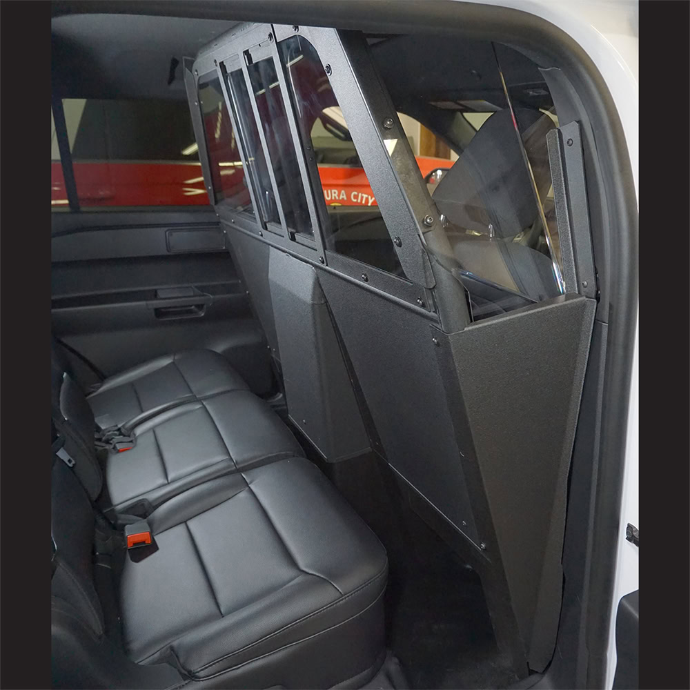 Troy Products Ford Police Interceptor Utility | Explorer Civilian universal sedan front partition kit is designed with a large sliding window for increased driver visibility and view of detainee. Window has a vertical bar bracket bolted in place to prevent it from being kicked out with a crawl-through prevention guard. Sliding window mechanism located in recessed center area where weapon mounts are bolted. Patented recessed center for accommodating vertical mounting weapons between seats. The upper-side panels are made from .25” thick polycarbonate material. The front partition includes 100% driver-side seat slide for maximum leg room, side-curtain airbag compliance, rigid upper-wing panels designed to prevent access to officers, full tubular partition framing for added strength and integrity. 3-piece lower kick panel extension assembly designed to completely cover the gap between partition bottom and vehicle floor for a snug fit while optimizing back-seat foot room. Lower extension panel easily bolts to the front partition. Prevents access from underneath partition keeping possessions out of reach of the detainee. All welded construction made of steel, powder coat finish for years of even the most rugged service. No holes drilled design makes installation quick and easy resulting in labor savings! Designed and engineered for perfect fit. Proudly manufactured in the USA.