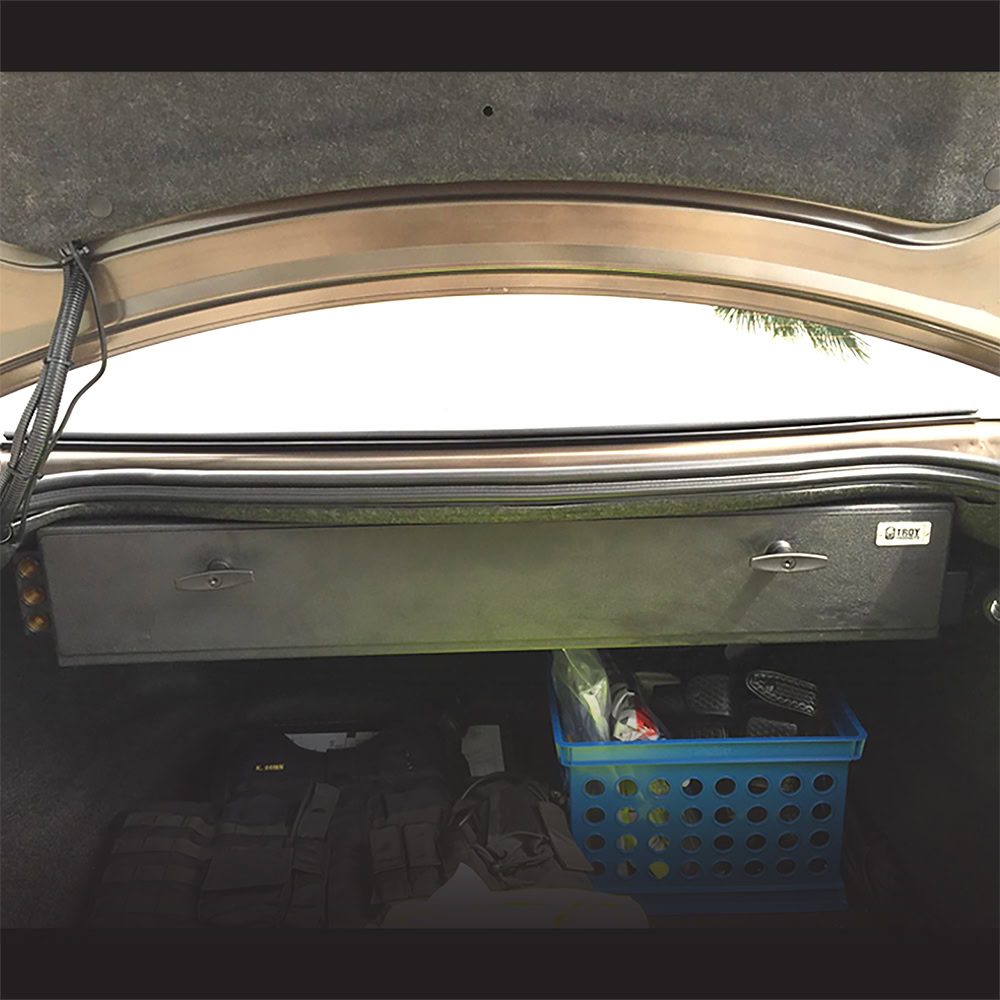 Troy Products heavy-duty single-drawer storage vault with heavy-duty ball-bearing slides. Exterior dimensions of 39″ W x 22″ L x 6.5″ H. Includes carpet on top of box, foam in floor and two (2) draw-tight locking handles. Organize and secure valuable cargo gear in this rugged TROY vault! Add TROY cargo rings to top of box for bungee cord anchor points. Designed and engineered for the perfect fit. Proudly manufactured in the USA.