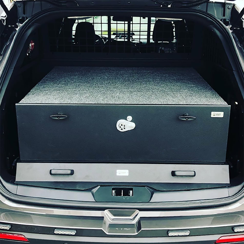 Troy Products single-drawer storage vault featuring heavy-duty ball-bearing slides. The exterior measures 40″ W x 32″ L x 12″ H. It comes with a carpeted top, foam lining in the floor, two (2) secure draw-tight locking handles, one (1) push button lock and key override. Keep your valuable cargo gear organized and secure in this durable TROY vault. This vault is among the most favored options for mid-size SUVs! It is designed and engineered for an ideal fit. Proudly manufactured in the USA.