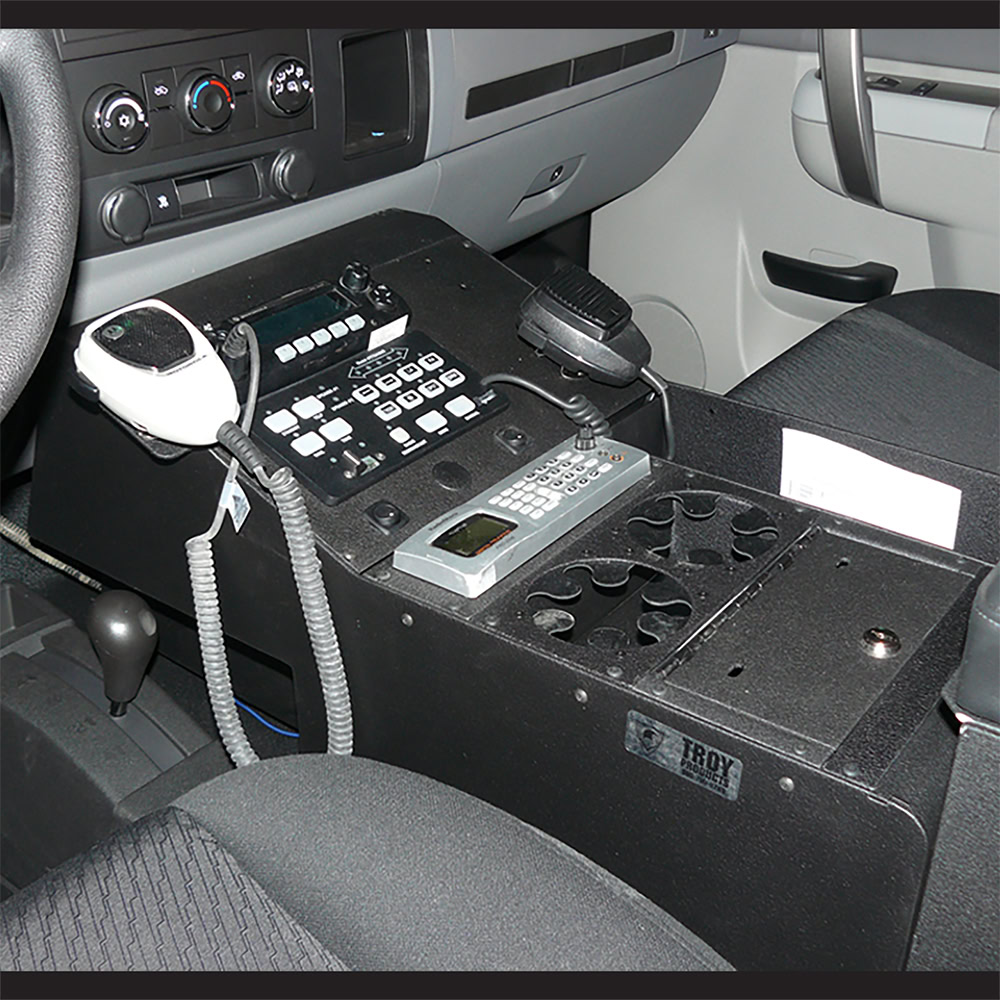 Troy Products offers a universal wide-body sloped console designed for trucks equipped with a factory floor shifter. The console features an 8″ sloped faceplate area, allowing for the installation of essential electronics at a forward and elevated position to maintain a clear line of sight on critical control heads. Additionally, there is a 12″ level faceplate area that provides generous space for console accessories, including cup holders, storage trays, extra outlets, and more. This specially design ensuring safety, comfort, and functionality. Proudly manufactured in the USA.