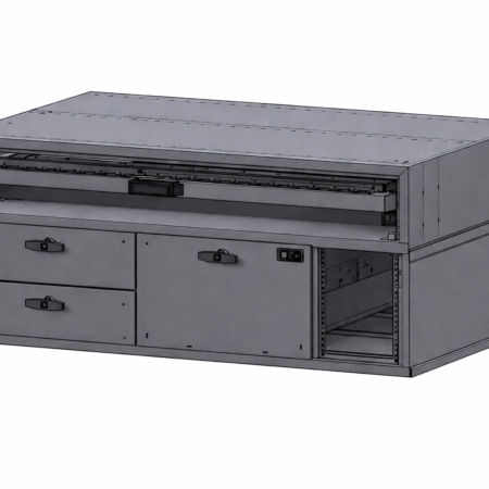 Chevrolet Silverado 2500; Truck Bed Command Post and Cabinets; Two Side Cabinets, One Center Command Post with Two (2) File Drawers, White Board, Pop-Up TV Stand, Center Shelf and Top Cover